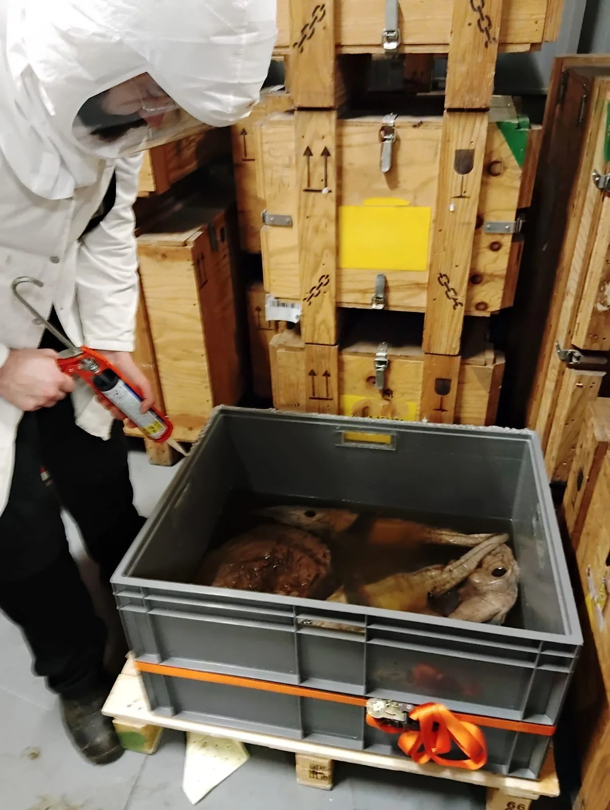 Nous sommes intervenus avec Kraniata sur un reconditionnement d’urgence pour le compte d'un établissement privé. Les spécimens étaient conditionnés dans un contenant inadapté à une conservation pérenne et fortement dégradé. Afin d'éviter la rupture de celui-ci, une solution d'urgence a été retenue pour transférer les spécimens dans un environnement plus stable dans l'immédiat.